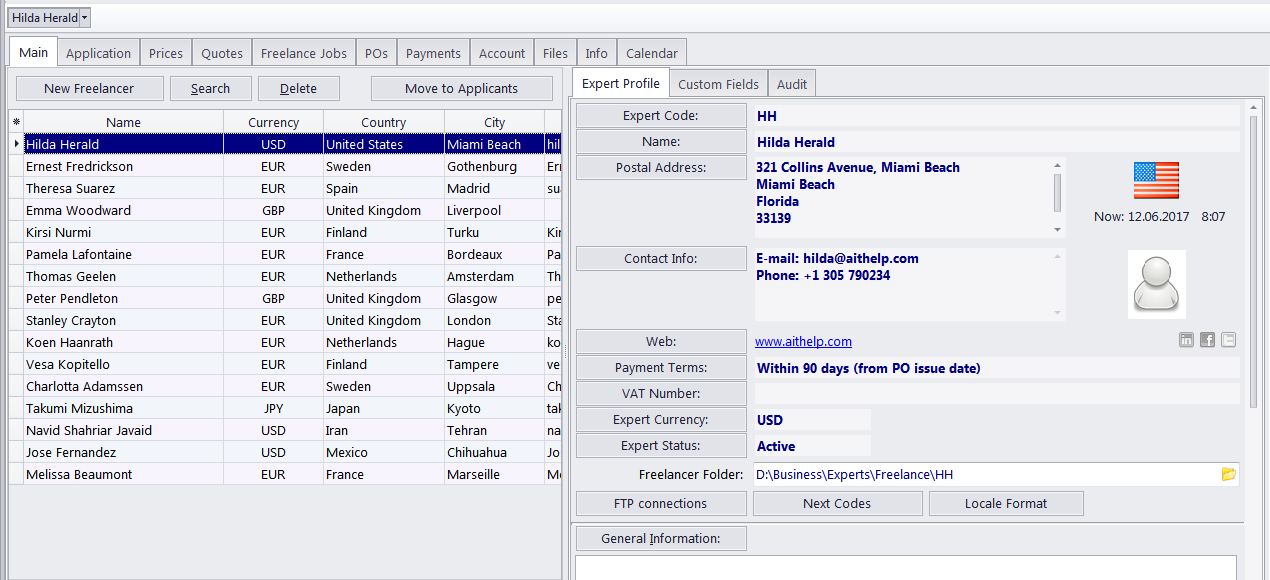 The Main tab of the Freelancer window contains information on your freelance experts. You can add new freelancer records here, or edit existing ones. The two primary areas of the Main tab the freelancers list and the freelancer profile.