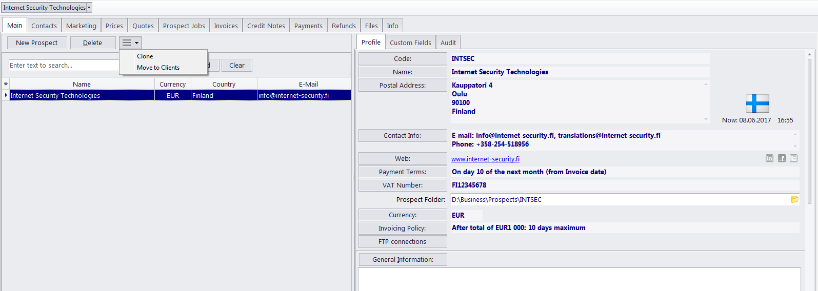 VAT Number — enter the prospect's legal tax number to have it automatically displayed and printed on invoices when the prospect is converted into a client.
